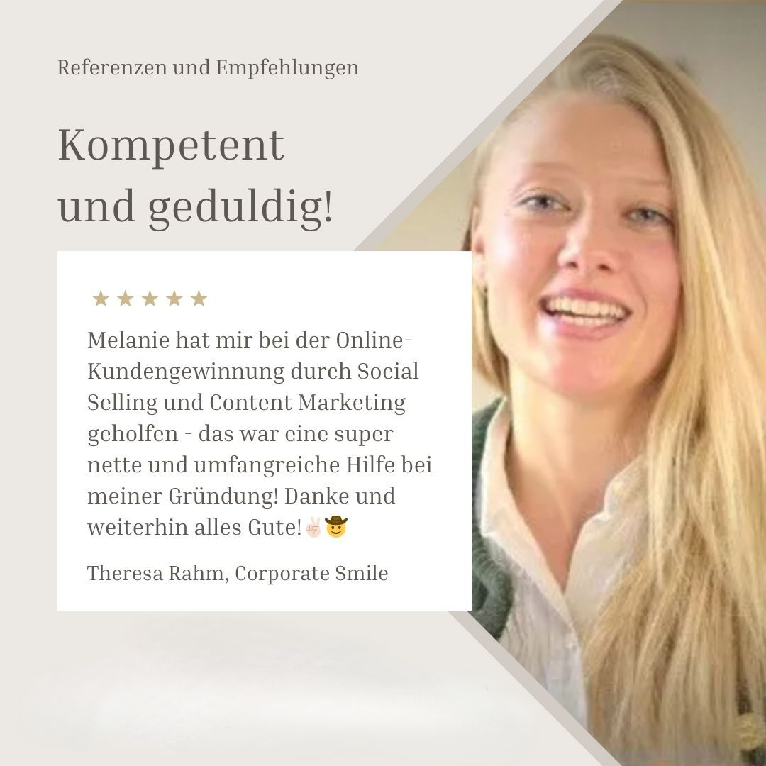 Durch Social Selling und Content Marketing gewinnen Sie als kleines oder mittelständisches Unternehmen Neukunden ohne Telefonakquise und gut qualifizierte Fachkräfte durch Employer Branding bzw. Personalmarketing. Ich berate Sie gerne! Kontakt: info@melanie-christine.de